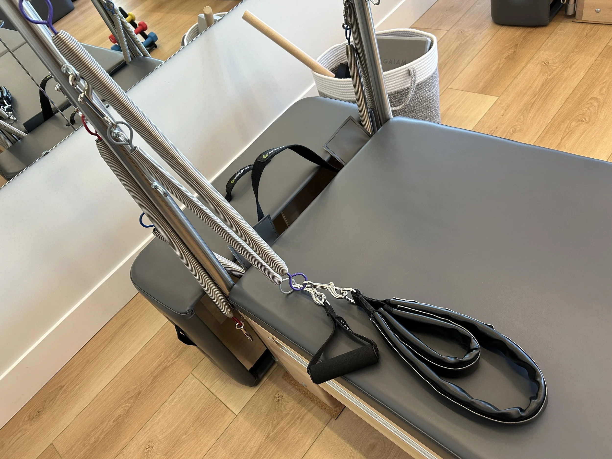 At the studio we have therapeutic yellow arm springs and stronger classical grey arm springs that are connected to handles we hold with our hands to strengthen our upper body. We place our feet inside the loops that attach to either lighter purple leg springs or the more challenging red leg springs to work the lower body.