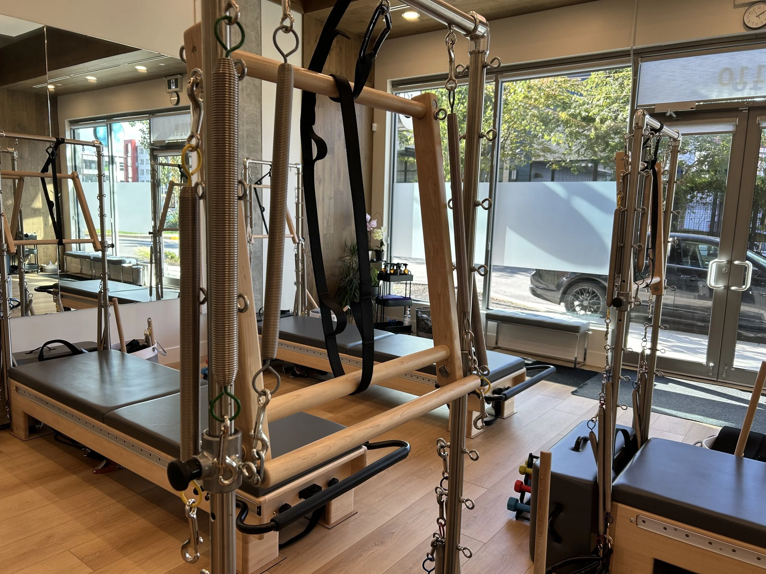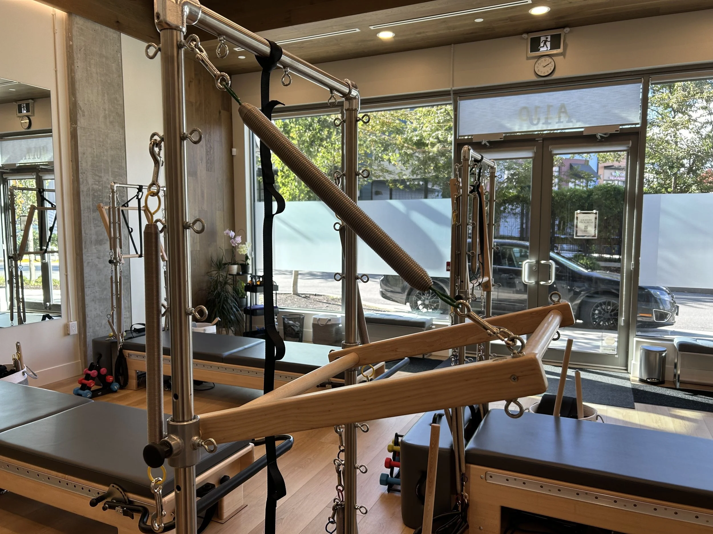 Here at Pilates Life Studio, in our private room we have a full Trapeze Table, while in our main studio we have Tower units as pictured below.